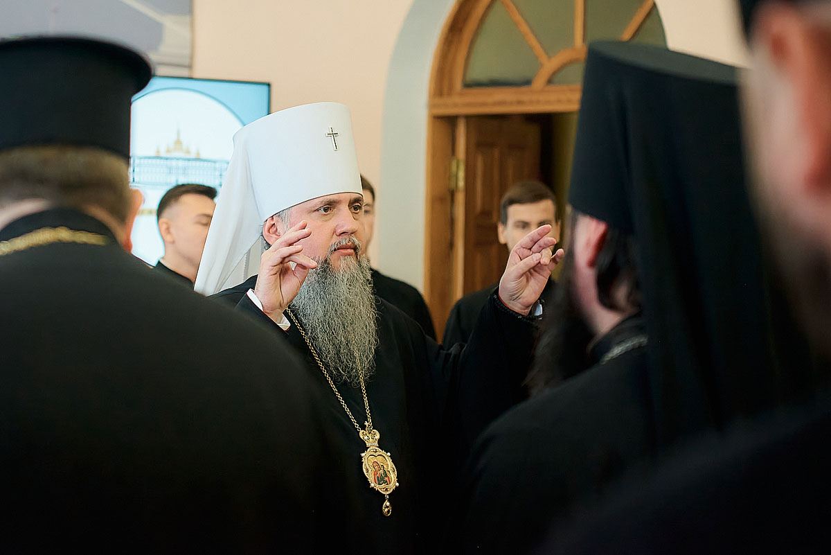 Під час малого входу Митрополит Епіфаній відзначив викладачів академії, що в сані, черговими богослужбовими нагородами. Завершилася відправа хресним ходом, після якого Предстоятель звернувся до вірних зі своїм першосвятительським словом.