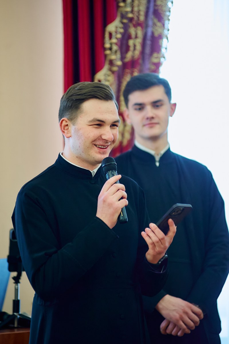 Від імені студентської спільноти до Його Блаженства звернувся голова студентської ради Назар Хомяк, який щиро привітав Предстоятеля з днем народження та сьомою річницею інтронізації, подякувавши за молитву, приклад пастирського служіння й увагу до духовного становлення молоді.