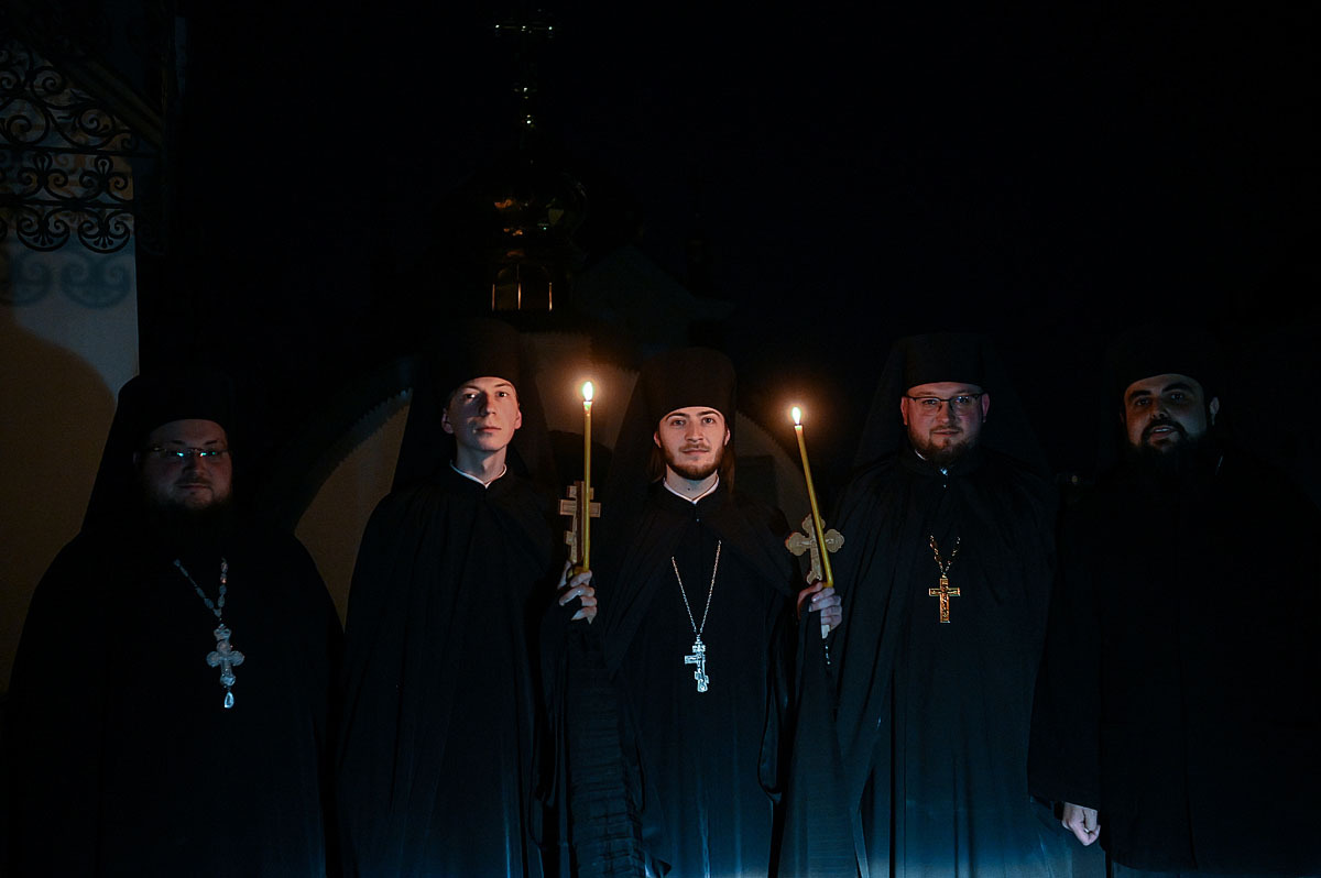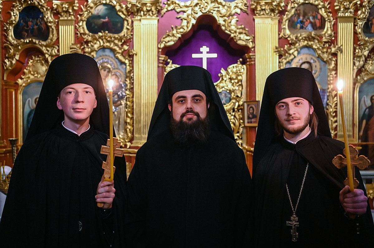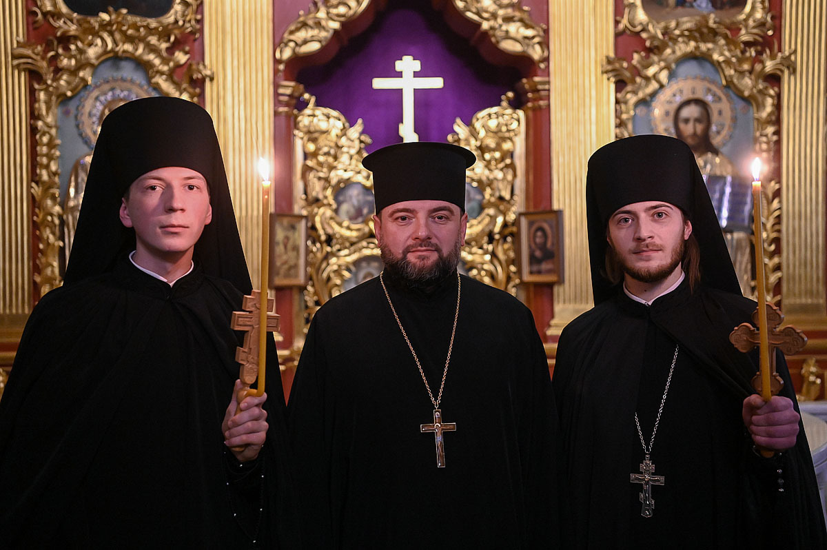 У богослужінні взяли участь намісник обителі єпископ Бориспільський Авраамій, архієпископ Вишгородський Агапіт, братія монастиря, ректор протоієрей Ярослав Романчук, викладачі та студенти КПБА, рідні й близькі новопострижених ченців.