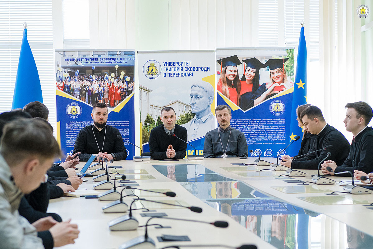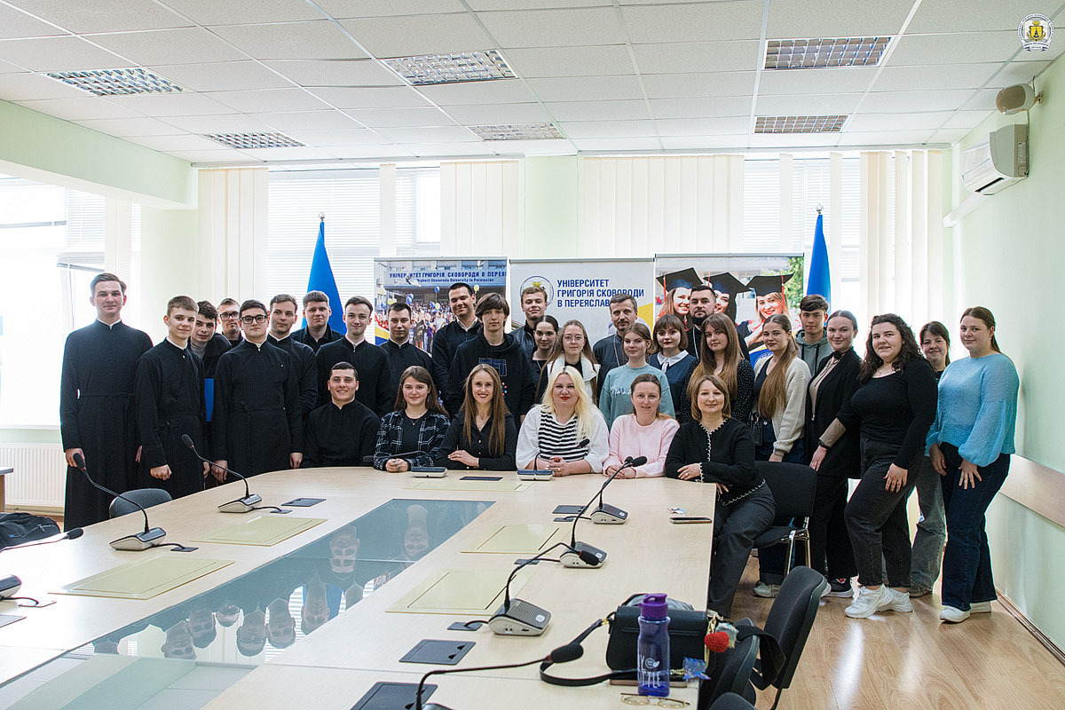 Зустріч зі студентами розпочалася з пізнавальної екскурсії Університетом Григорія Сковороди. Після першого знайомства з університетським середовищем учасники зібралися на чаювання, що стало нагодою для невимушеного спілкування та своєрідною підготовкою до подальшої змістовної розмови.