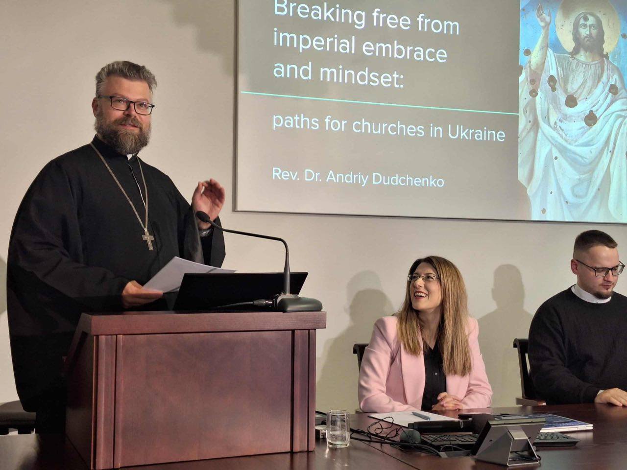 У доповіді під назвою «Визволення від імперських обіймів та менталітету: шляхи для церков в Україні» прот. Андрій Дудченко поділився особистою історією як священика Православної Церкви України, народженого в Донбасі, та свідченням про еволюцію українського православ’я в умовах російської агресії. Доповідач розповів про вплив московського патріархату на українське суспільство з 1990-х років, коли ідеї «триєдиної Русі» та згодом «русского міра» стали інструментом ідеологічного впливу та підґрунтям для збройної агресії.