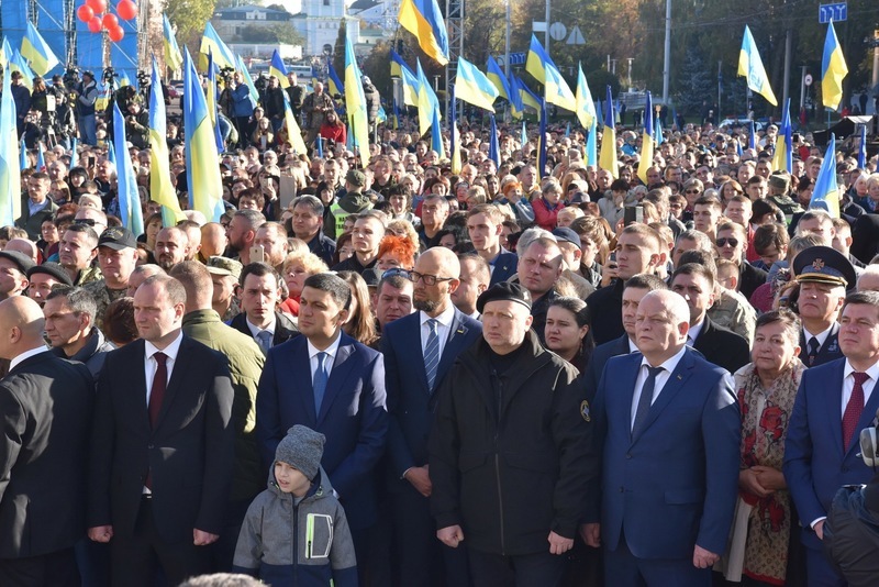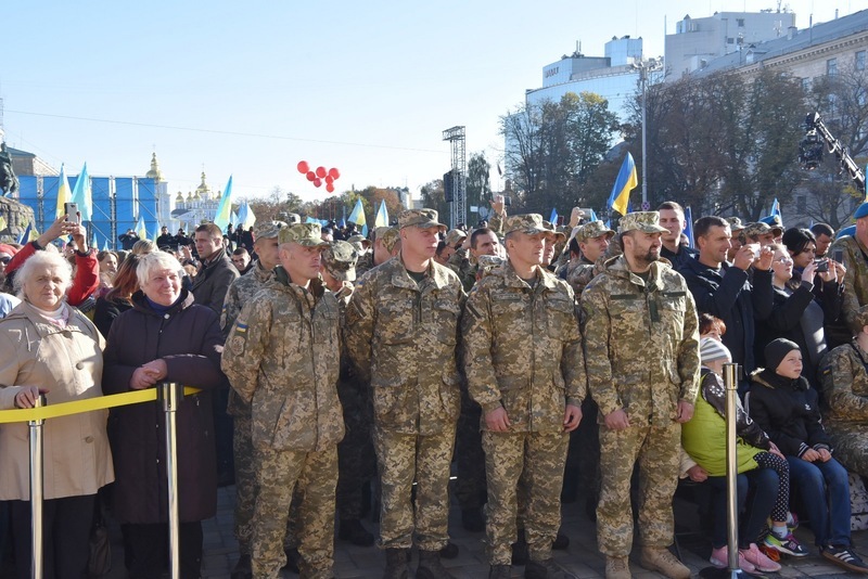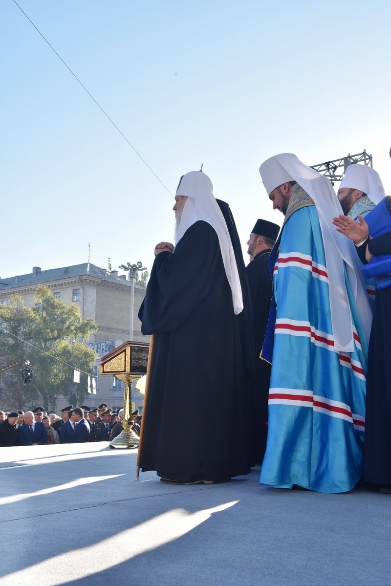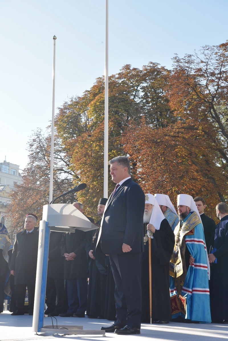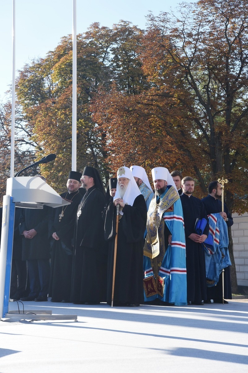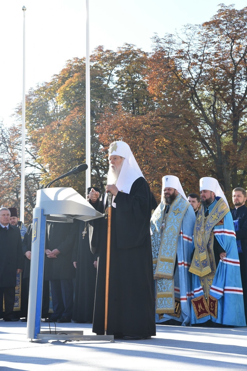 На початку заходу були виголошені урочисті слова та вітальні промови. Після виступу Глави держави до присутніх звернувся Предстоятель Київського Патріархату: “Вельмишановний Петро Олексійович Порошенко, Президент України, шановна наша влада, дорогі захисники Вітчизни, дорогі браття і сестри. Я від імені нашої Церкви Київського Патріархату поздоровляю вас зі святом Покрову Божої Матері, Днем захисника України, а найбільше, з одержанням перемоги в отриманні автокефалії Української Церкви. Отримання автокефалії Української Церкви – це епохальна перемога, яку ми отримали протягом 1030-ти років існування Православної Церкви на нашій землі.