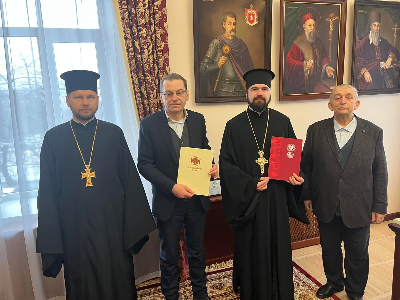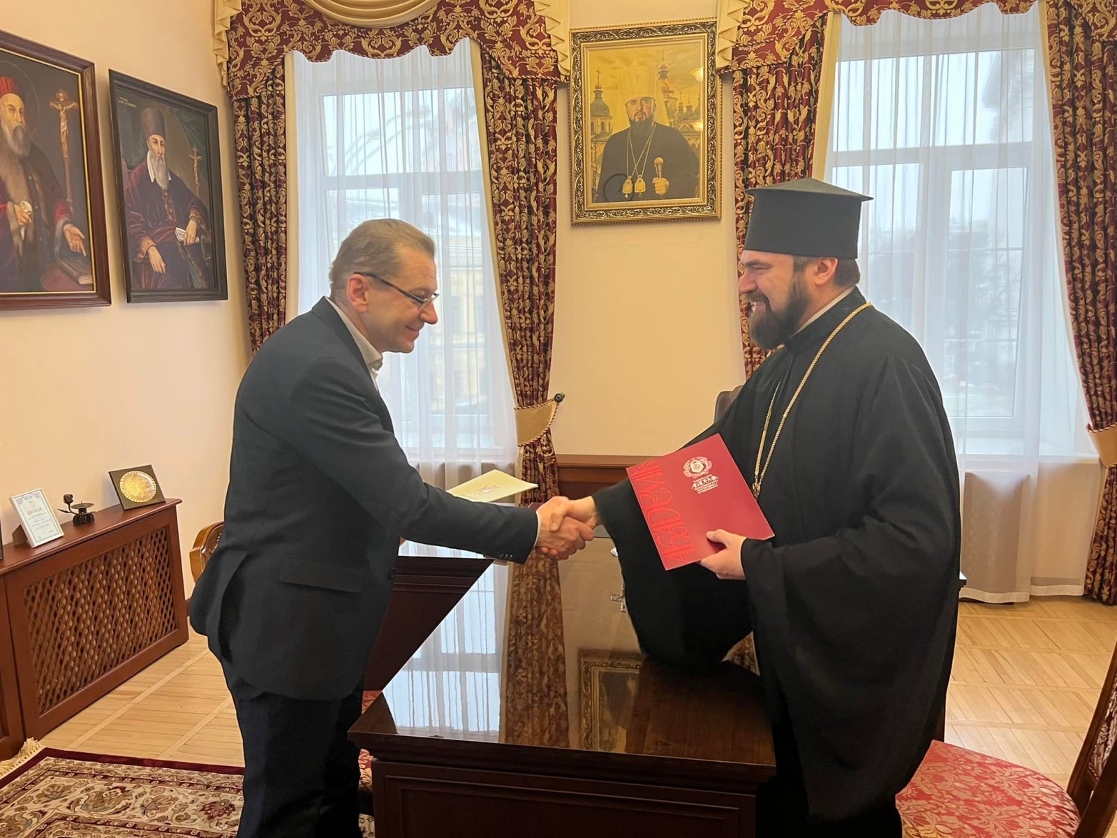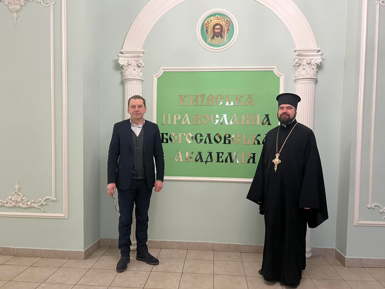 На зустрічі були присутні проректор з наукової роботи КПБА професор протоієрей Віталій Клос та помічник ректора НАОМА професор Микола Христофорович Корецький.