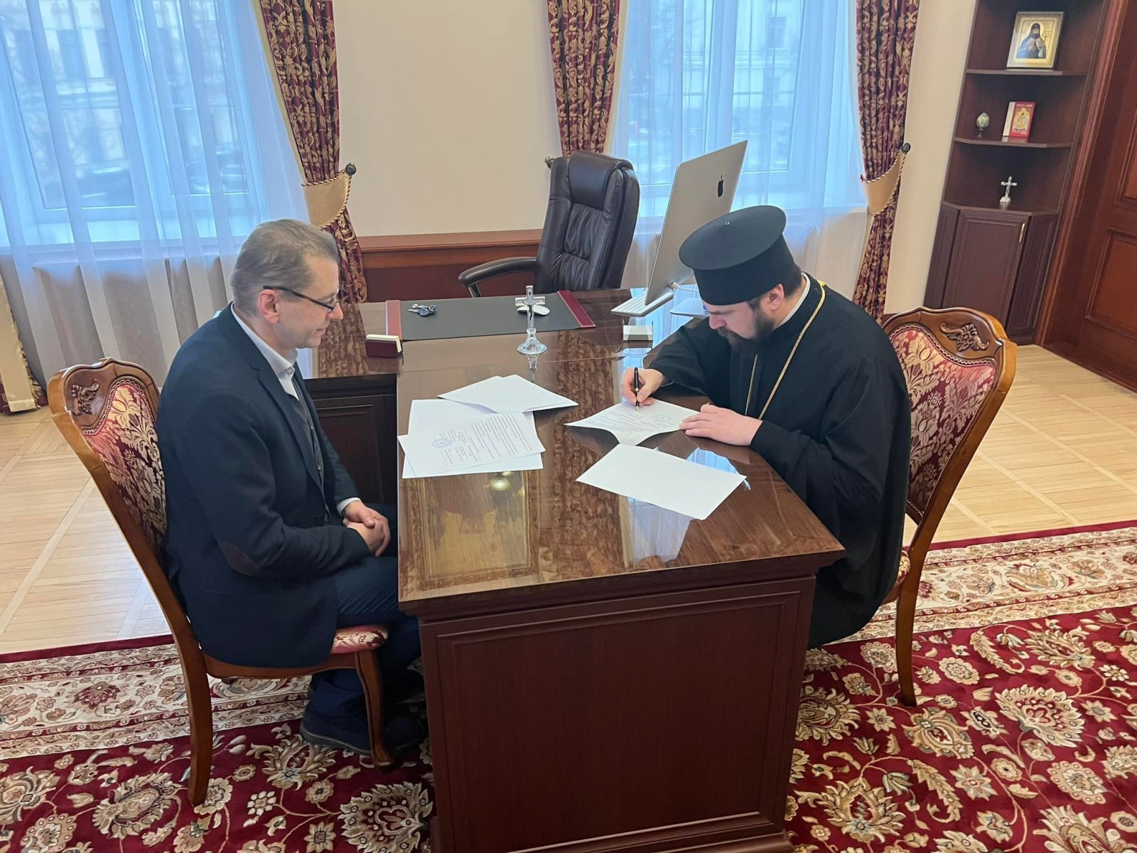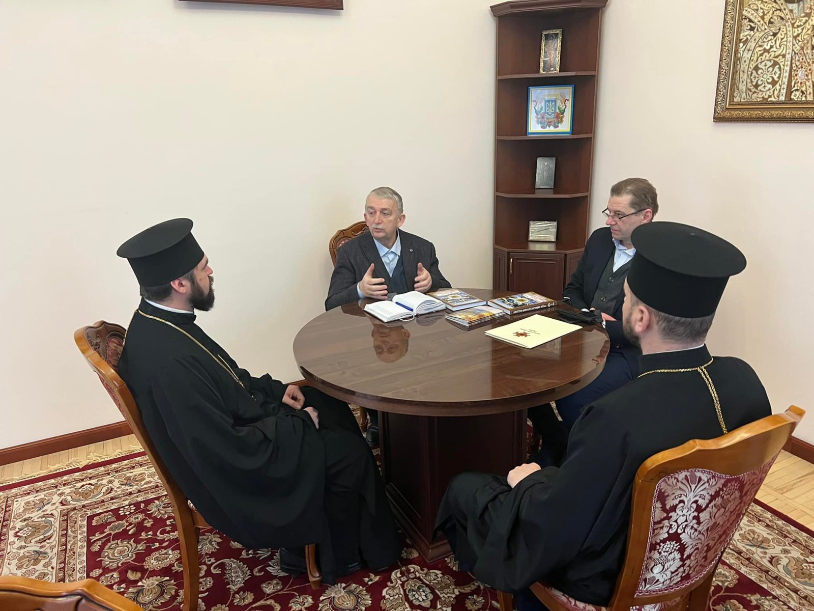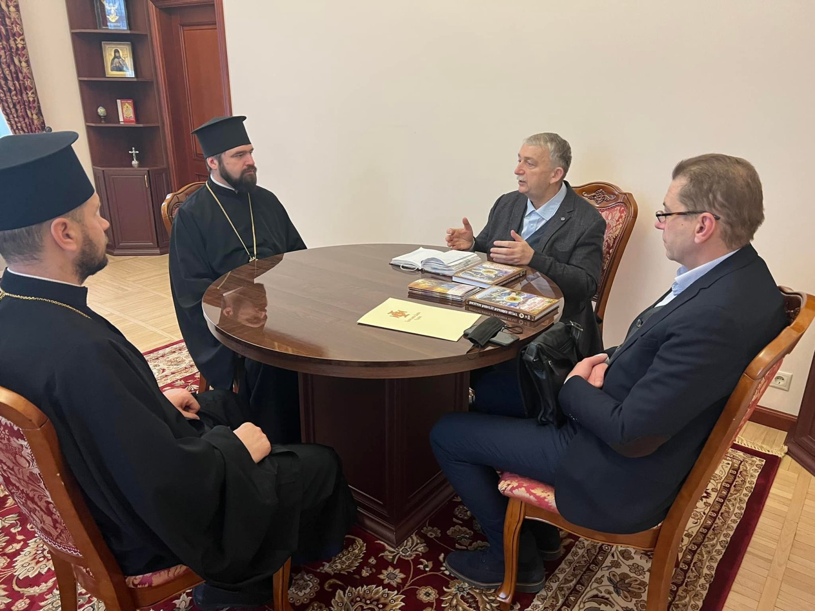На зустрічі були присутні проректор з наукової роботи КПБА професор протоієрей Віталій Клос та помічник ректора НАОМА професор Микола Христофорович Корецький.