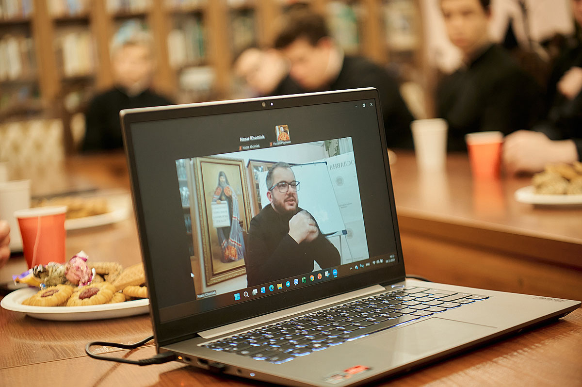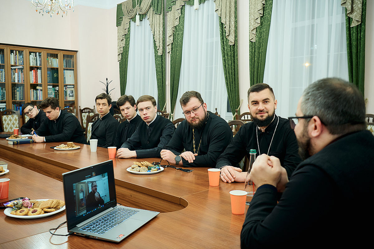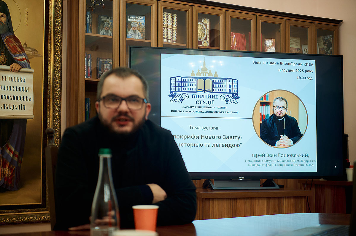 На студіях зі студентами зустрівся ієрей Іван Гошовський — викладач кафедри Священного Писання КПБА та священник храму святителя Миколая Чудотворця ПЦУ м. Запоріжжя. Отець Іван навчався на богословському факультеті Університету Аристотеля в Салоніках та має ґрунтовне дослідження, присвячене Другому апокаліпсису Якова з бібліотеки Наг-Хаммаді.