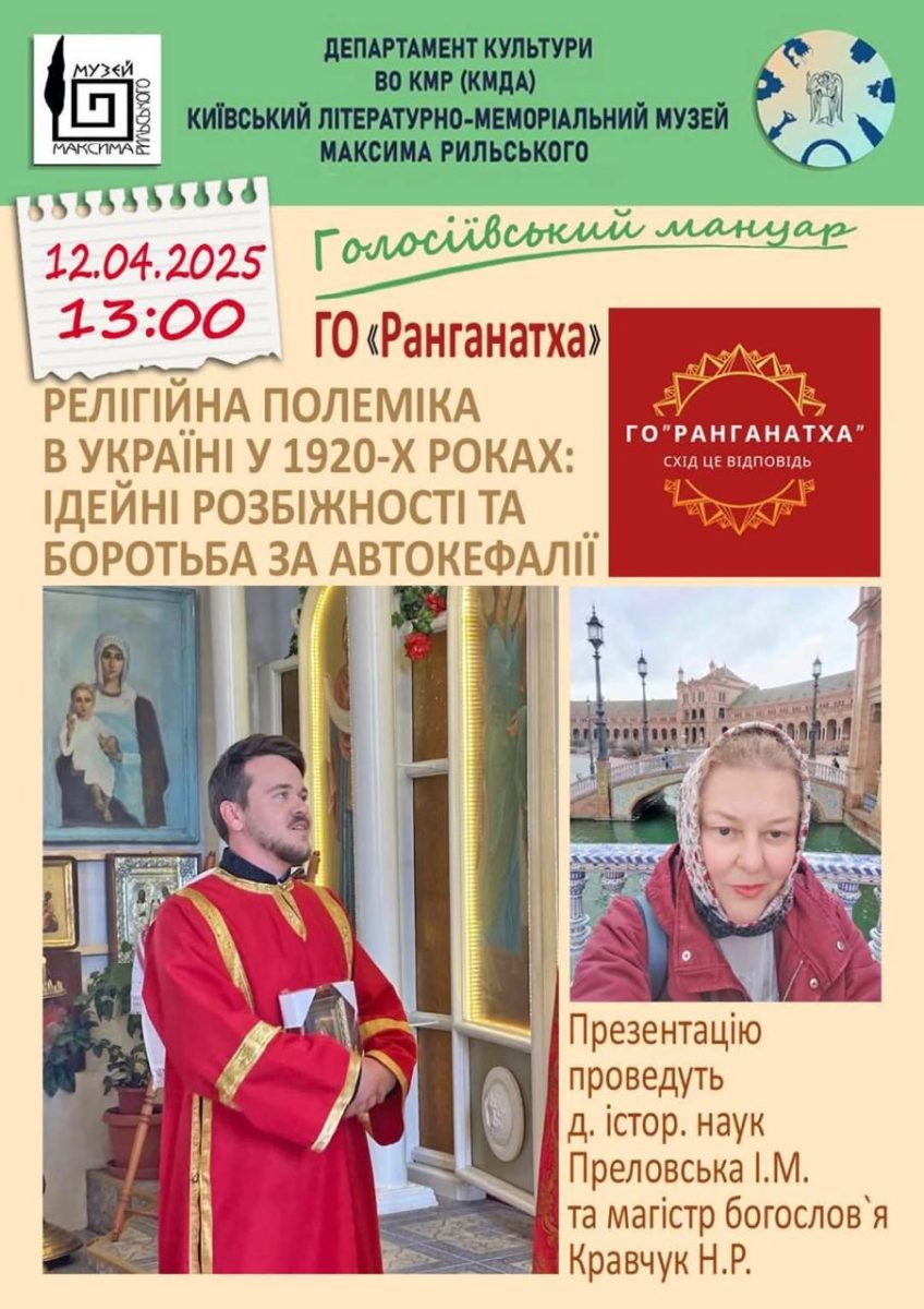 12 квітня в Київському літературно-меморіальному музеї Максима Рильського за підтримки ГО “Ранганатха” відбулася спільна лекція: “Полеміка між діячами УАПЦ та УАПСЦ у 1920-х роках: ідейні розбіжності та боротьба за автокефалію”.