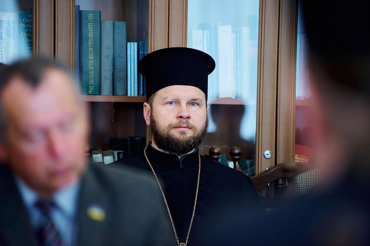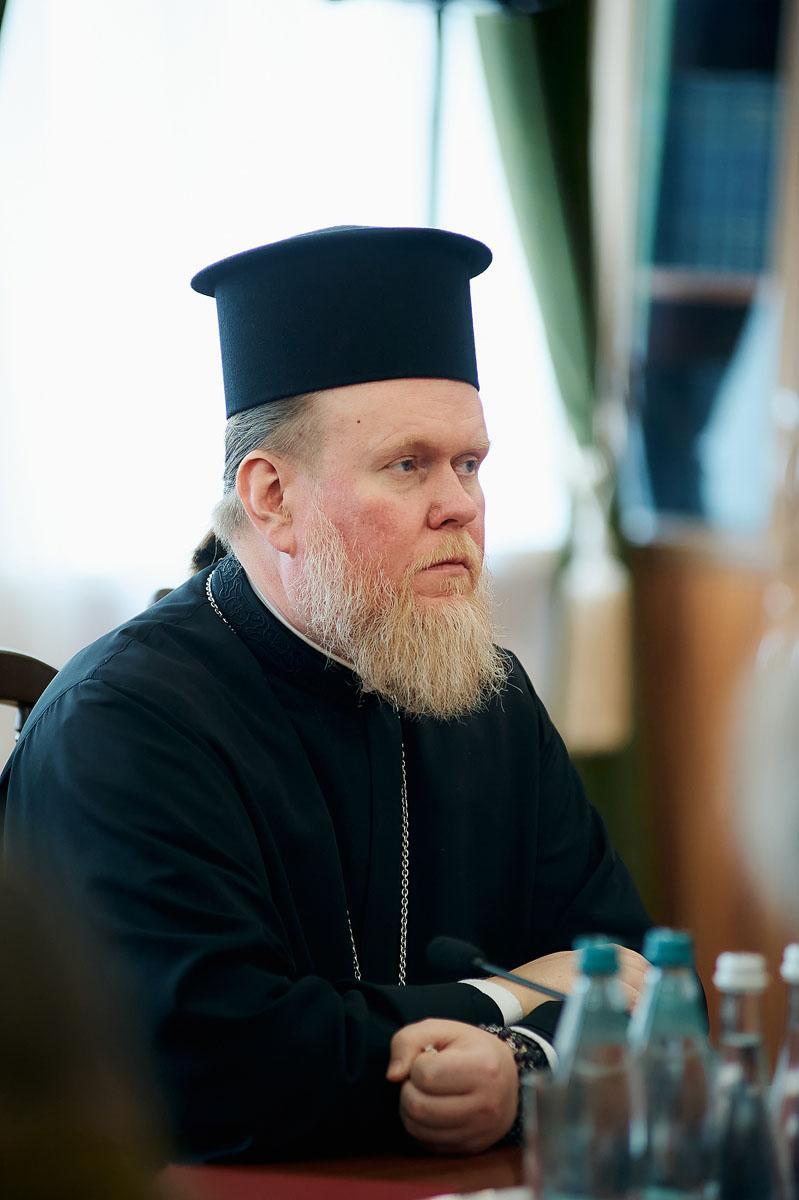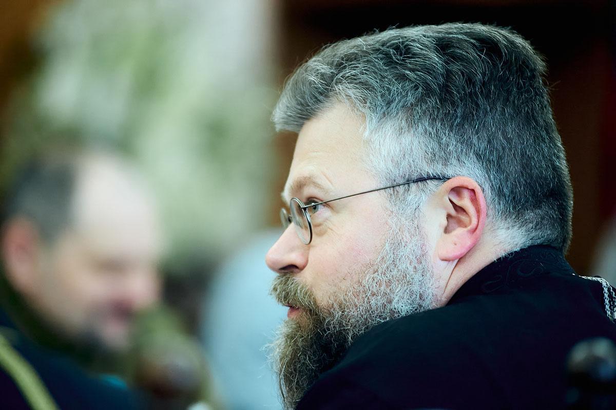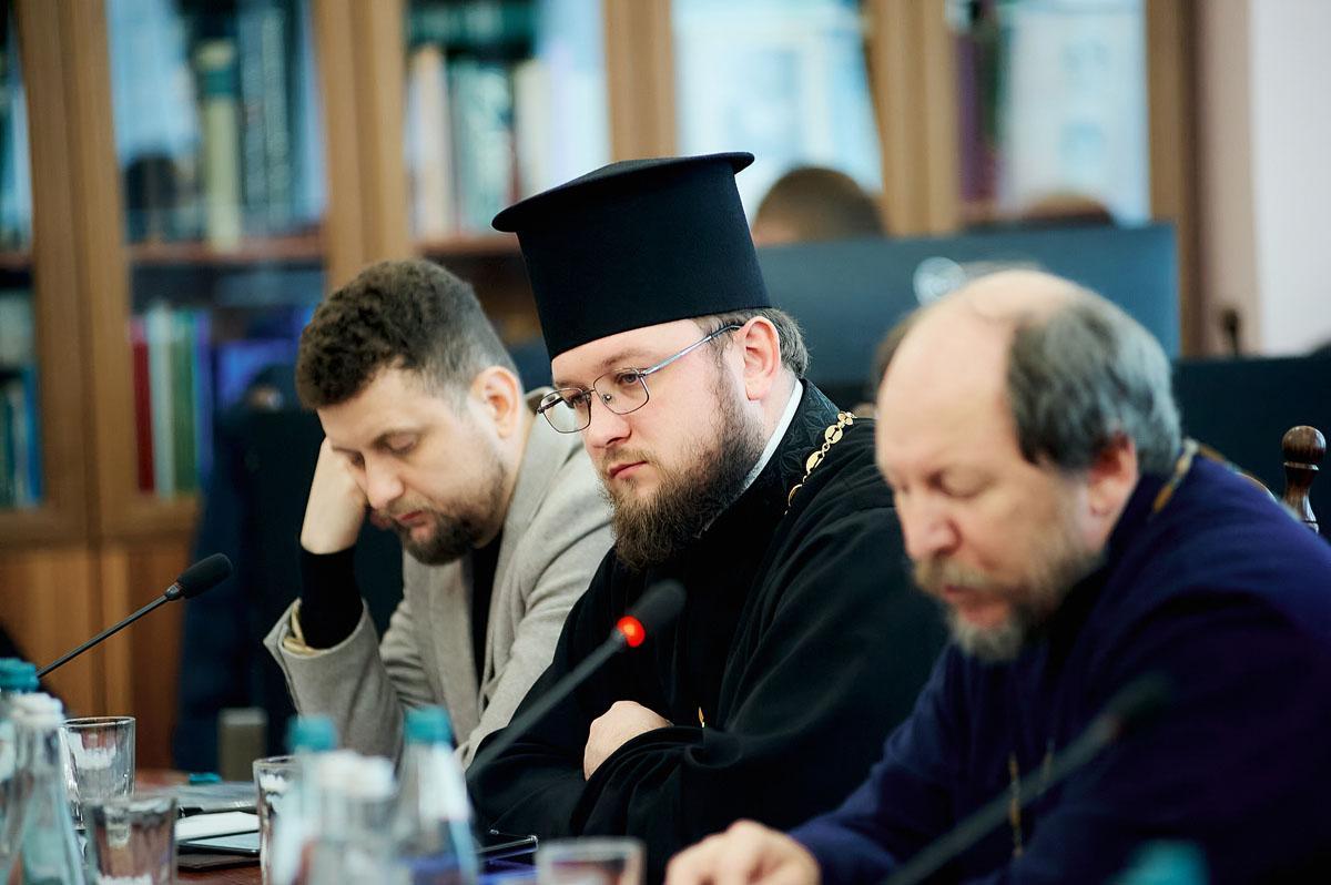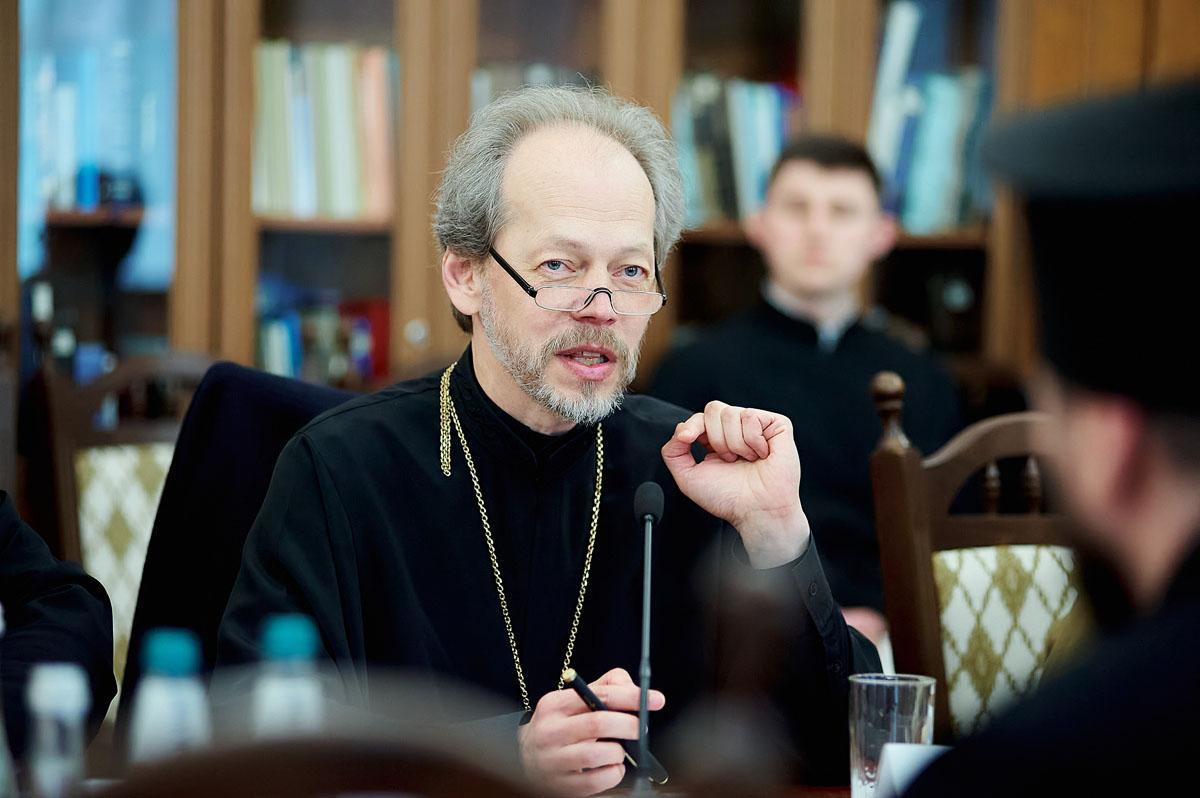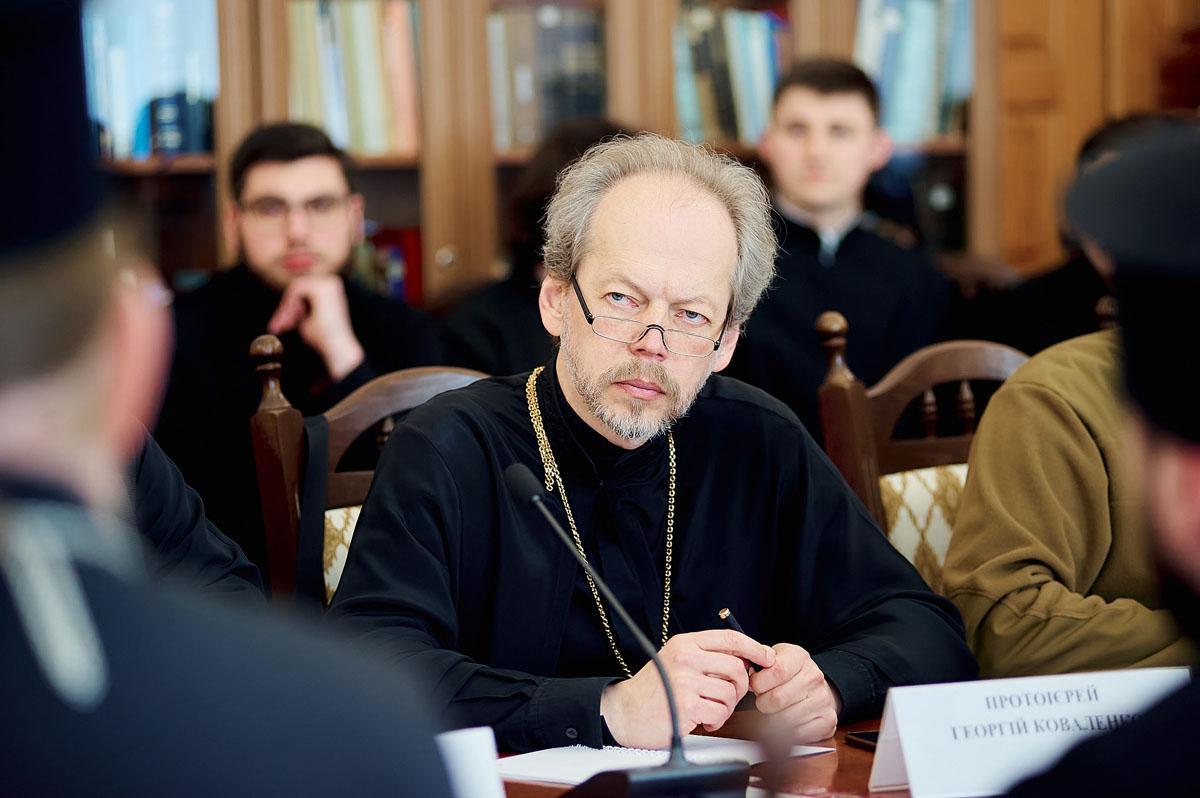 Відкрив засідання ректор КПБА професор протоієрей Олександр Трофимлюк. Він передав вітання учасникам зібрання від Предстоятеля Православної Церкви України Блаженнішого Митрополита Епіфанія, ознайомив із програмою круглого столу та зосередив увагу на актуальності та важливості наукового заходу.