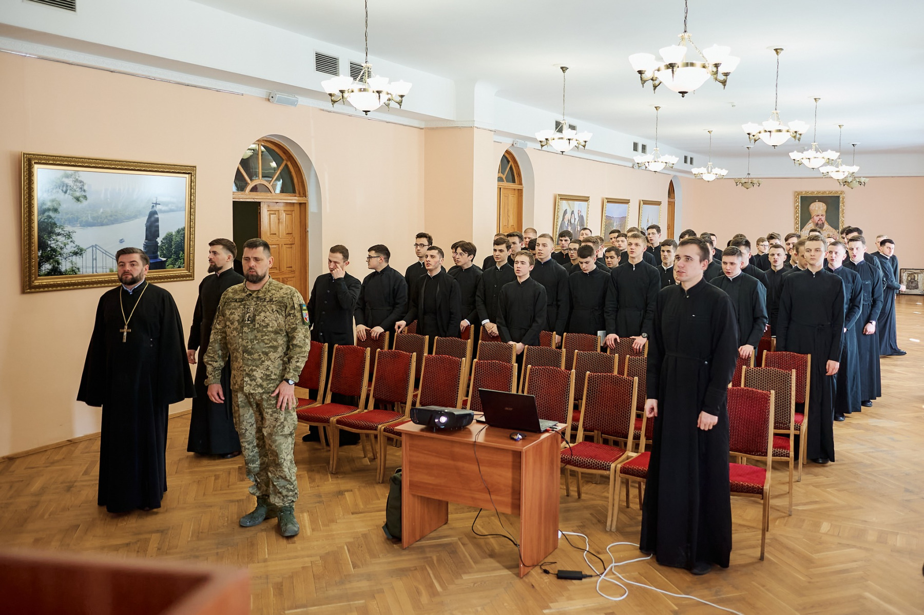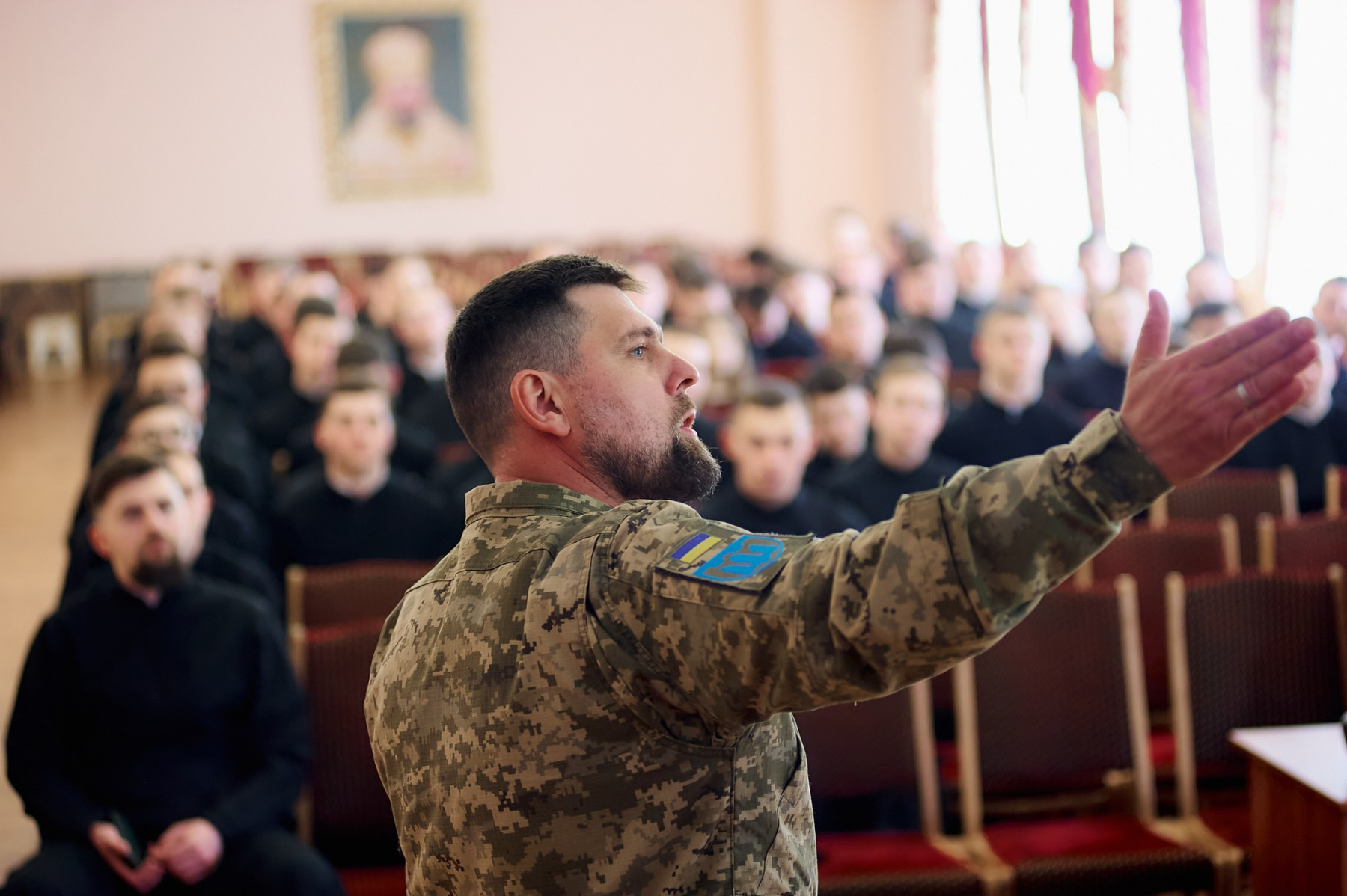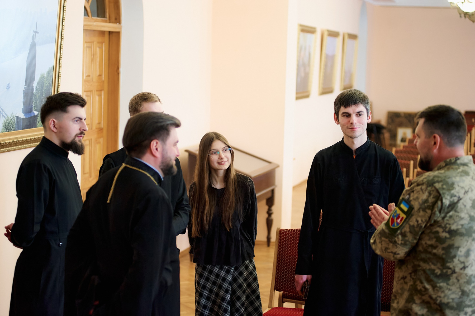 Почалась зустріч зі вступного слова першого проректора, протоієрея Ярослава Романчука, який наголосив на важливості духовної опіки наших солдатів, особливо на передовій, а також представив слухачам лектора.