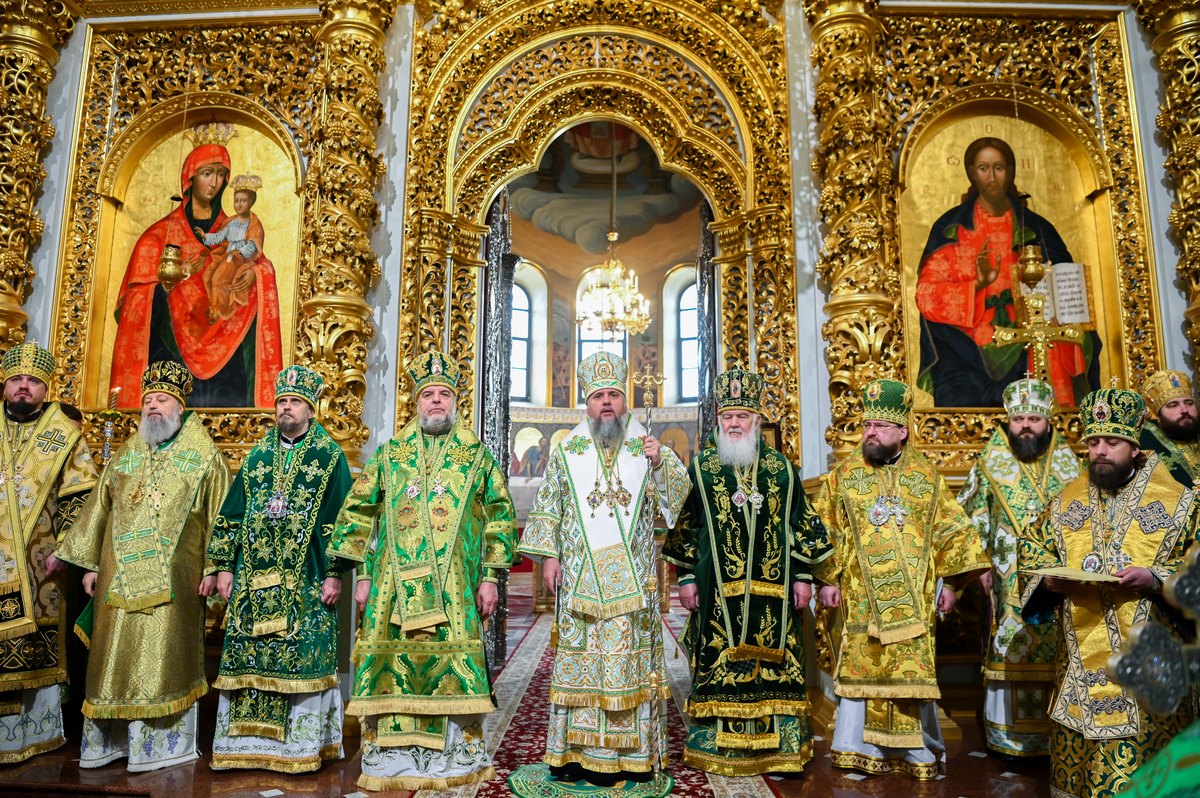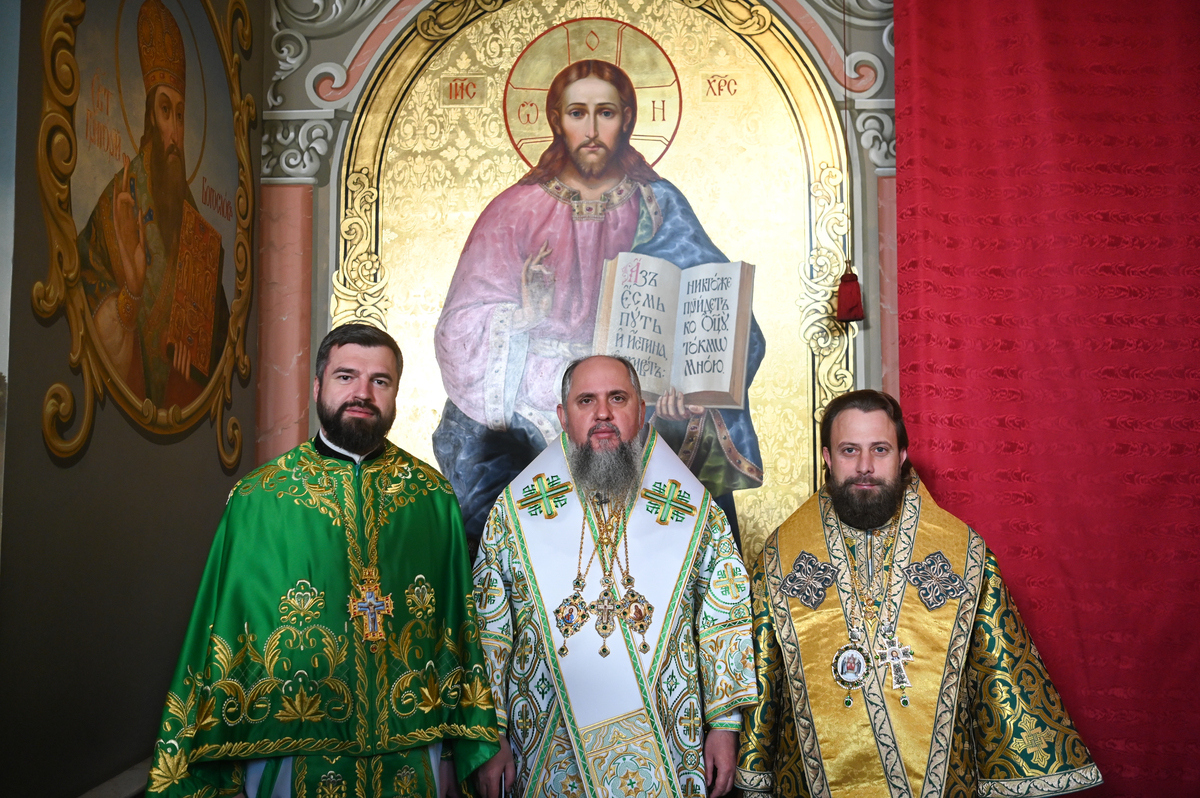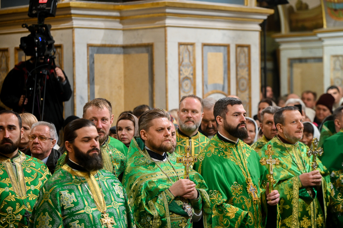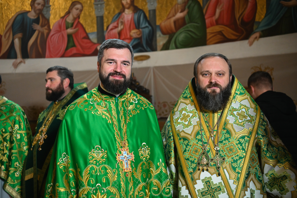 Предстоятелю автокефальної Української Православної Церкви співслужили митрополит Львівський Макарій, митрополит Вінницький і Барський Симеон, митрополит Львівський і Сокальський Димитрій, митрополит Тернопільський і Кременецький Нестор, архієпископ Луганський і Старобільський Лаврентій, архієпископ Хмельницький і Шепетівський Павло, єпископ Житомирський і Овруцький Паїсій, єпископ Васильківський Єфрем, єпископ Богуславський Арсеній, намісник обителі єпископ Бориспільський Авраамій, всечесна братія монастиря та запрошене духовенство, зокрема ректор Київської православної богословської академії професор протоієрей Олександр Трофимлюк.