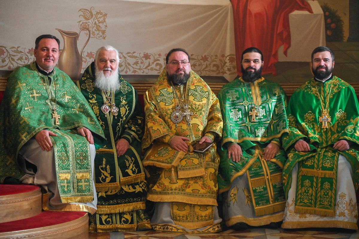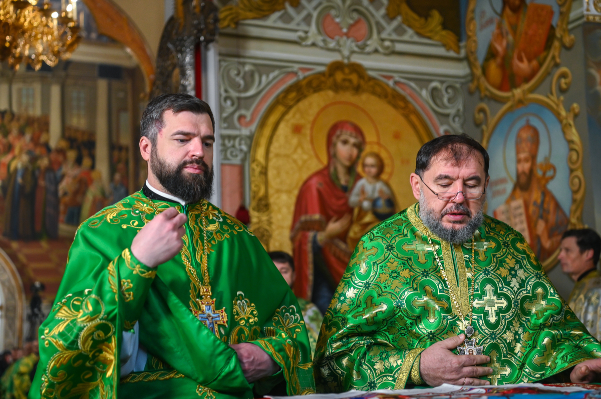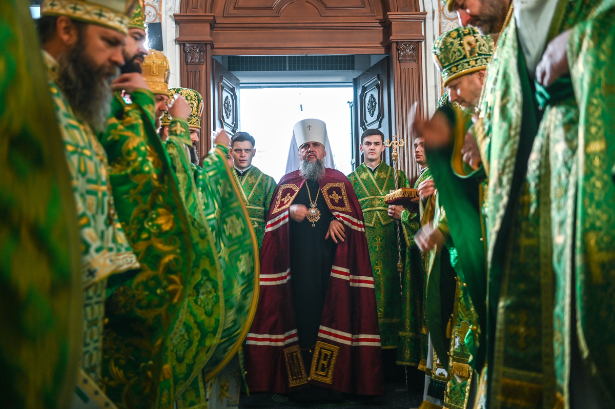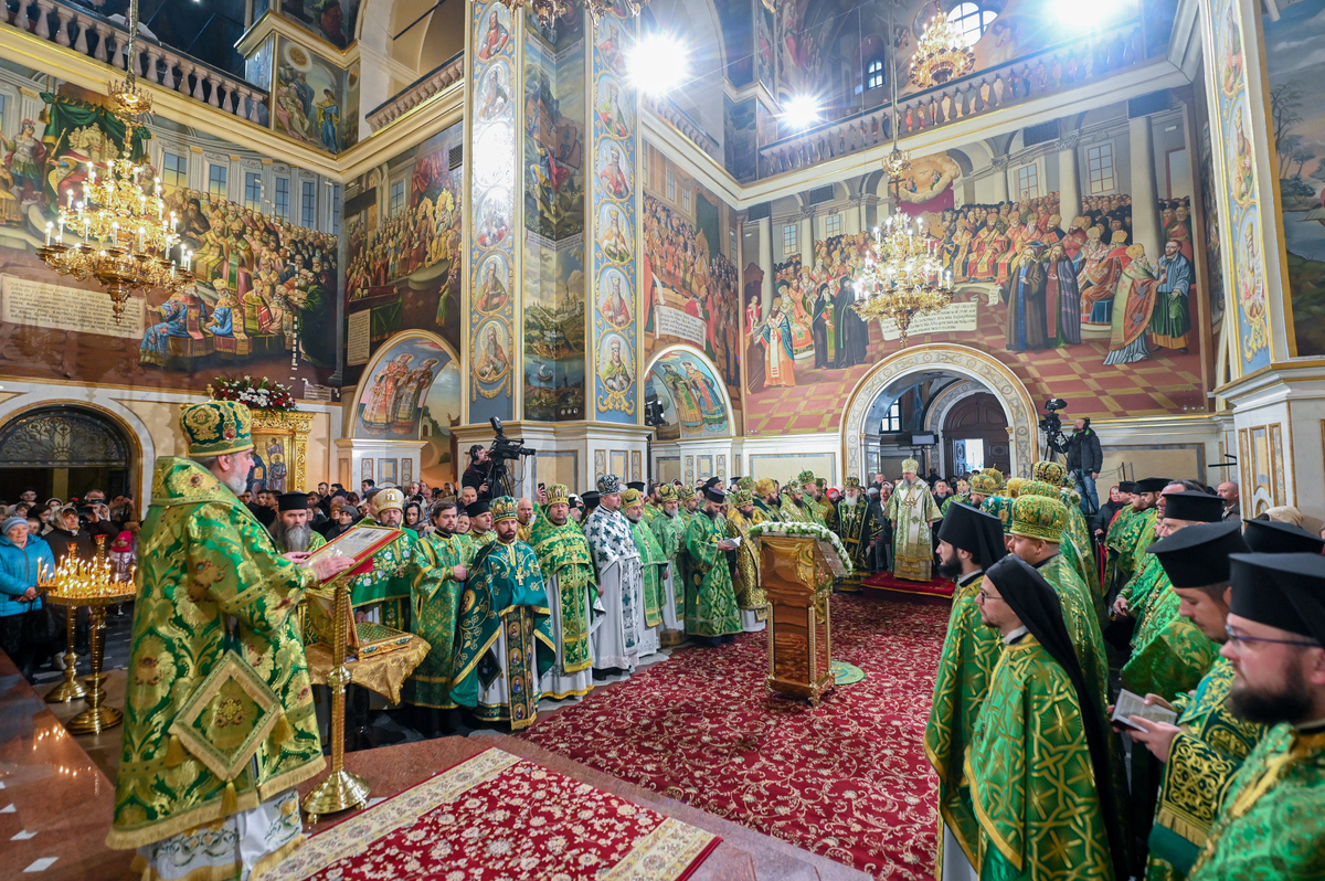 Предстоятелю автокефальної Української Православної Церкви співслужили митрополит Львівський Макарій, митрополит Вінницький і Барський Симеон, митрополит Львівський і Сокальський Димитрій, митрополит Тернопільський і Кременецький Нестор, архієпископ Луганський і Старобільський Лаврентій, архієпископ Хмельницький і Шепетівський Павло, єпископ Житомирський і Овруцький Паїсій, єпископ Васильківський Єфрем, єпископ Богуславський Арсеній, намісник обителі єпископ Бориспільський Авраамій, всечесна братія монастиря та запрошене духовенство, зокрема ректор Київської православної богословської академії професор протоієрей Олександр Трофимлюк.